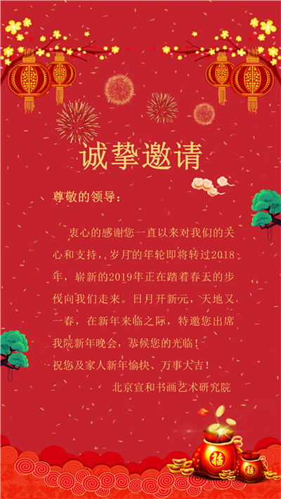 “翰墨飘香弘国粹、丹青焕彩咏华章”2019年来临之际,北京宣和书画艺术研究院联手国粹书画进百姓家俱乐部举办“2019迎新春·庆年会”活动,邀您一道齐聚我院,贺禧即将到来的猪年。届时将邀请将军、部长、艺术家、特型演员、明星、企业家等出席年会共襄盛举,喜迎2019年。