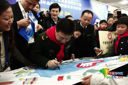 杨利伟在孩子们绘制的“中国志愿者”旗上签名。中国青年网记者张思怡 摄