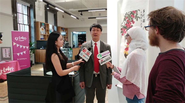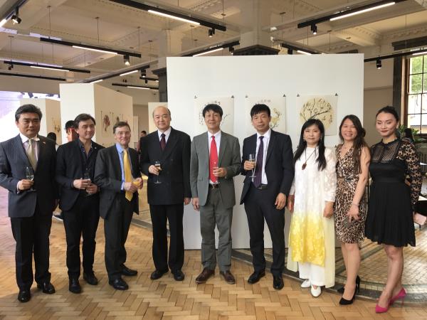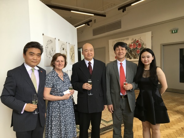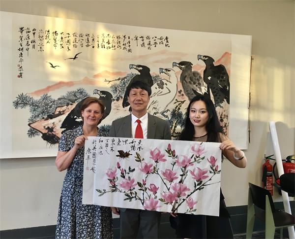 除了国粹牡丹之外,更让孙总领事感到震撼的是胡乐平先生画的玉兰花。玉兰花在英格兰北部,刚刚开放完。他表示,玉兰花寓意着美好的生活,寓意着美好的希望,也是寓意着中英将美好发展。今年是将“一带一路”国际峰会提出倡议发展的一年,从中国到英国远隔万里,但一条海洋通道、一条陆路通道,两国紧密相连。在纪念中英建交45周年的日子里,中国人民和英国人民,友好合作、互利共赢。