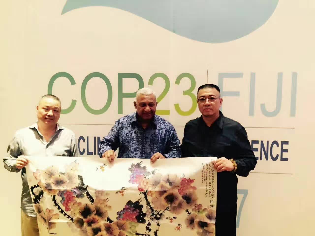 环球文化艺术网(杨东亮 报道):近日,正在北京参加第一届“一带一路”国际合作高峰论坛的斐济共和国总理姆拜尼马拉马,工业、贸易及旅游部部长柯亚在文化交流时收藏我国著名国礼艺术家赵言斋先生作品,并对中国书画作品的意境深远和神奇发出赞叹,斐济共和国总理姆拜尼马拉马表示非常荣幸能够收藏赵言斋先生的作品,赏赵言斋老师的葡萄作品,比吃到自然鲜活的葡萄更有一番滋味。