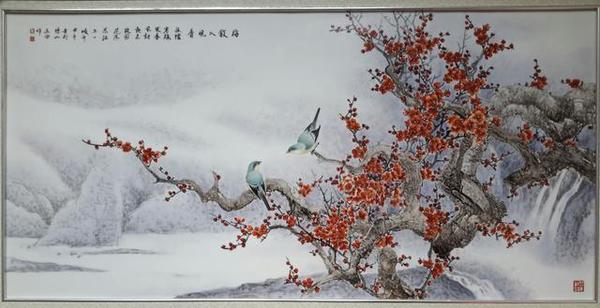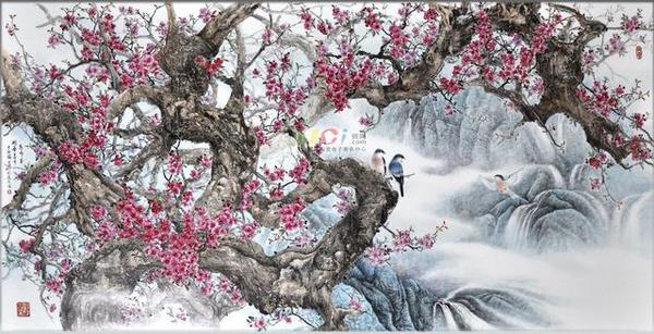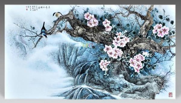 其次,在色彩的运用上,冯霖章明显的吸收了西方绘画对光与色之关系的理解和处理手法,使画面出现了丰富的变化和层次感。同时,他以微观的花鸟和宏观的山水相结合的画法,使画面产生以小见大,大中见小的崭新艺术效果。