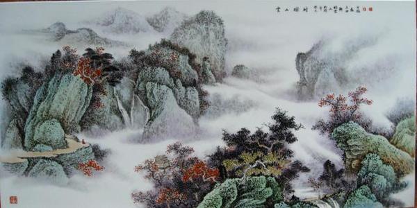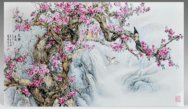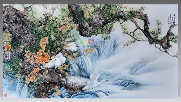 首先他把工艺绘画与泼墨泼彩所造成的幻化效果巧妙的结合起来。这种自然幻化的肌理效果与精工细琢的绘画互相渗透,混成一体,产生了极鲜明的特色,兼具有颇高的难度。要掌握这种有机的结合,必须有扎实的传统绘画基本功以及对泼墨泼彩所产生只幻化特性有长期深入的研究,同时亦要对生活有深刻的体会和具有想象力。