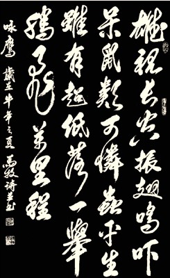 七绝《咏鹰》 马牧诗并书法 雄视长空振翅鸣, 吓呆鼠类可怜虫。 平生虽有超低落,一举腾飞万里程! (这首现场即赋的题画诗,使一幅《鹰》的画作价格当场翻过了十番)