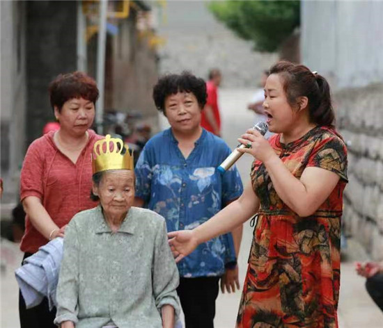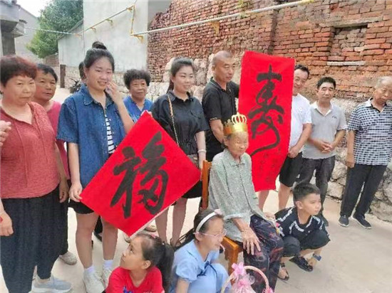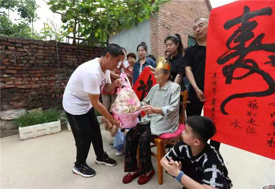 上午10点,志愿者们带上祝寿花馍,带上老人喜欢的歌舞戏曲来到老人家。王文晓会长代表全体志愿者给老人敬献国模并致祝寿词,全体志愿者及到场所有人员齐唱生日歌,让老人在欢声笑语中欣赏精彩的演出。