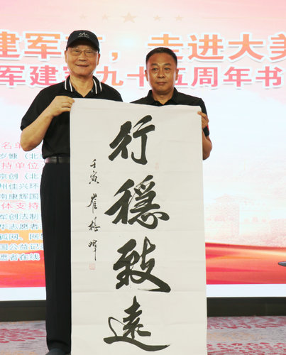 书画笔会现场,崔根峰、王胜利、张善飞、杨明学、程文鸣、田如晨、满文斗等书画家现场即兴创作,以字传情、以画抒怀,以鲜明的主题、高远的视角、多样的手法绘就了一幅幅或雄浑激荡,或秀美飘逸的书画作品。这些作品内容丰富、赏心悦目,充分汇聚了新时代关爱退役老兵的艺术力量、展现了当代军人的风采,表达对人民子弟兵的热爱与崇高敬意及拥政爱民氛围。这些书画作品,除了赠送主办方、承办方及爱心企业之外,大部分都赠送给活动现场的退伍老兵,并表达对退伍军人的深情厚谊。