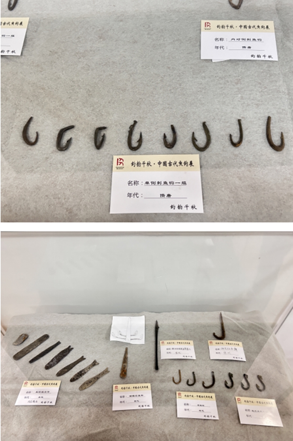 展览中,宾馆还了解到在人类历史发展的长河中,捕鱼是早期人类为了生存而获取食物的方法之一。早期捕鱼是用石头、木棍等物件砸鱼,在此基础上演化成了鱼矛、鱼卡(直钩)、鱼钩(用石头、贝壳、骨、牙、竹、青铜、铁等材料制成)。其中青铜鱼钩的出现,是鱼钩发展历史的巨大分水岭。
